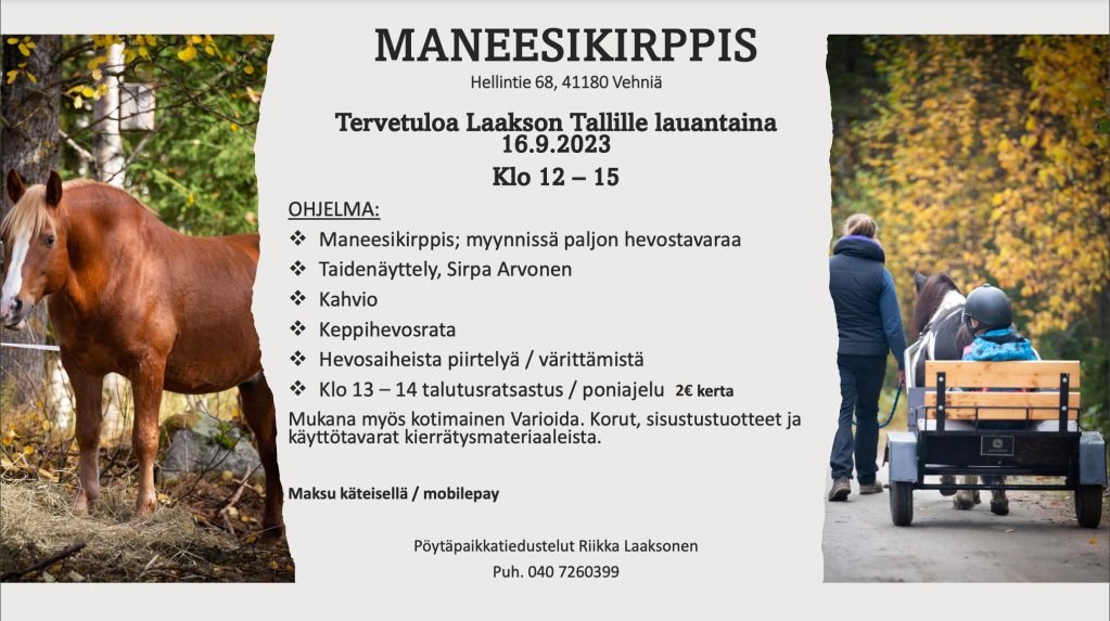 Tunnit järjestetään Laakson Tallilla Vehniällä. Ilmoittautuminen Riikka Laaksonen